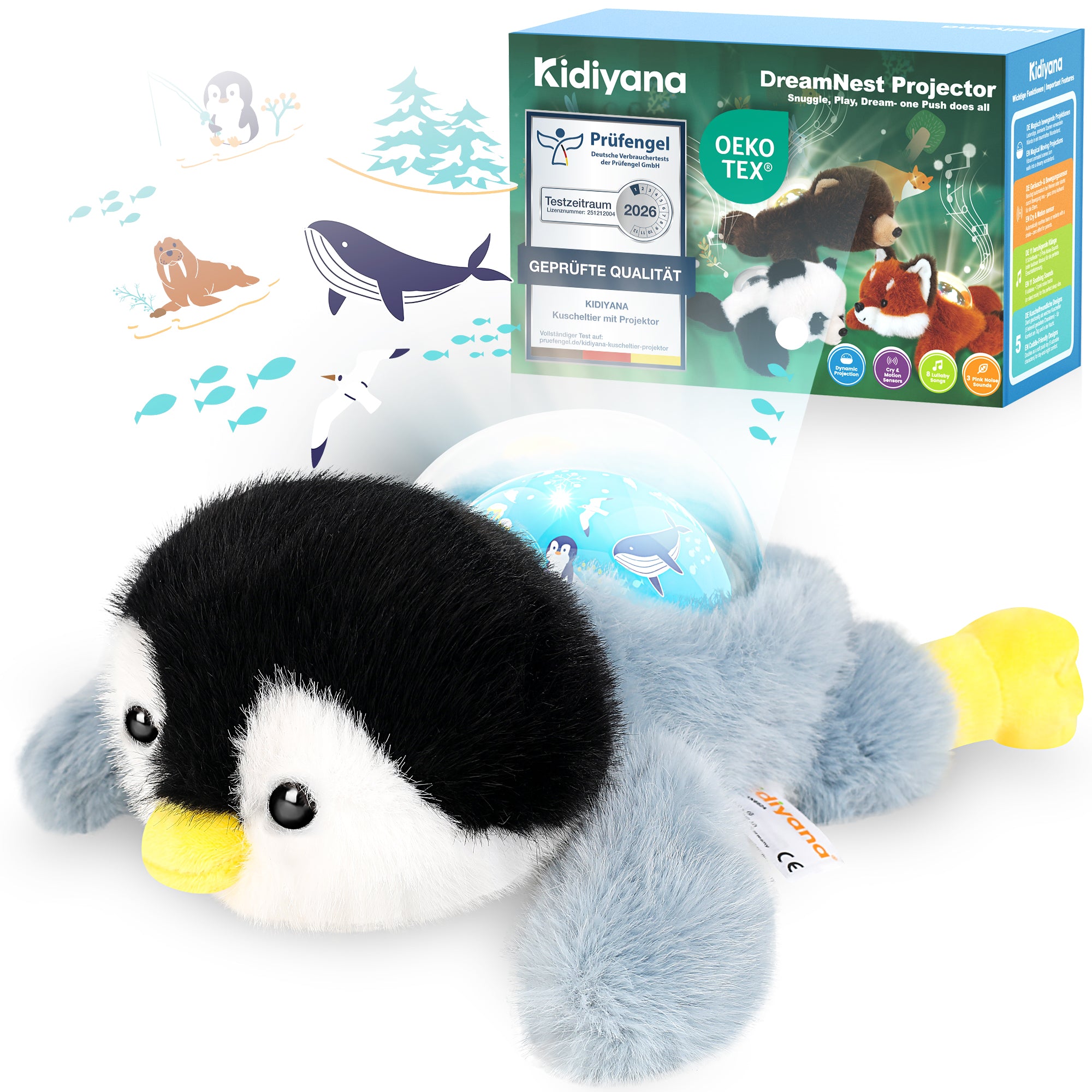 Kidiyana Dreamnest Projektor Pinguin – Wiederaufladbares LED Nachtlicht mit Sternenprojektion, Musikfunktion, USB-Akku und weichem Plüschtier