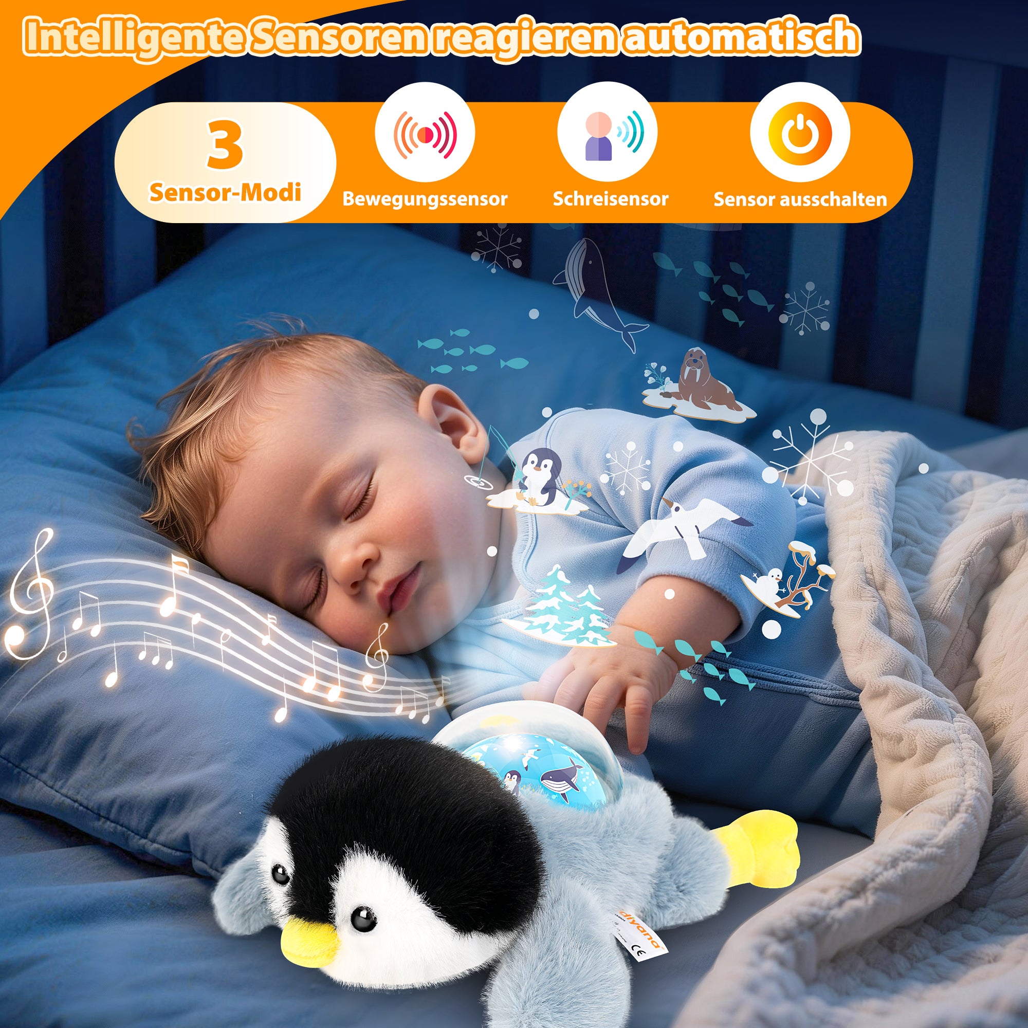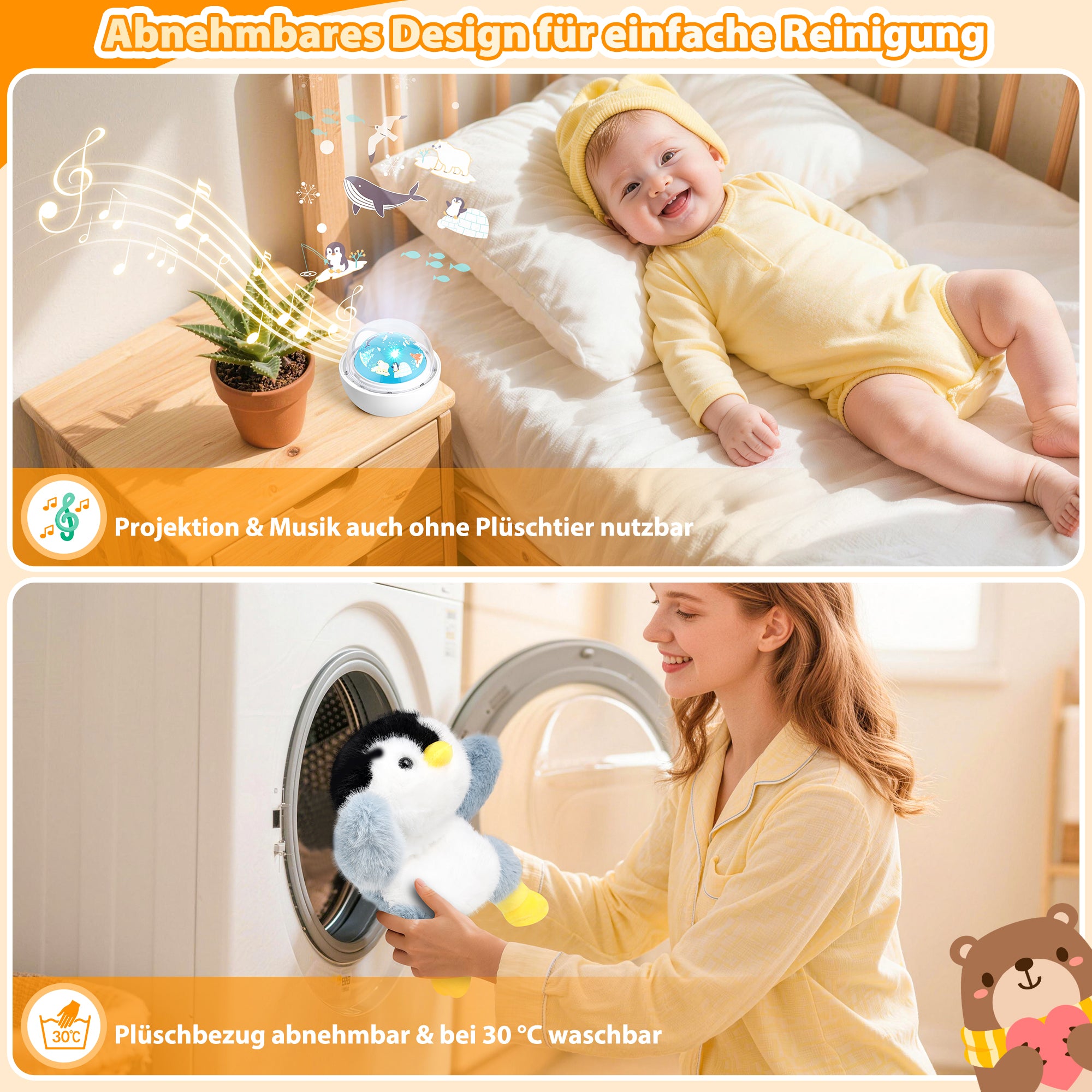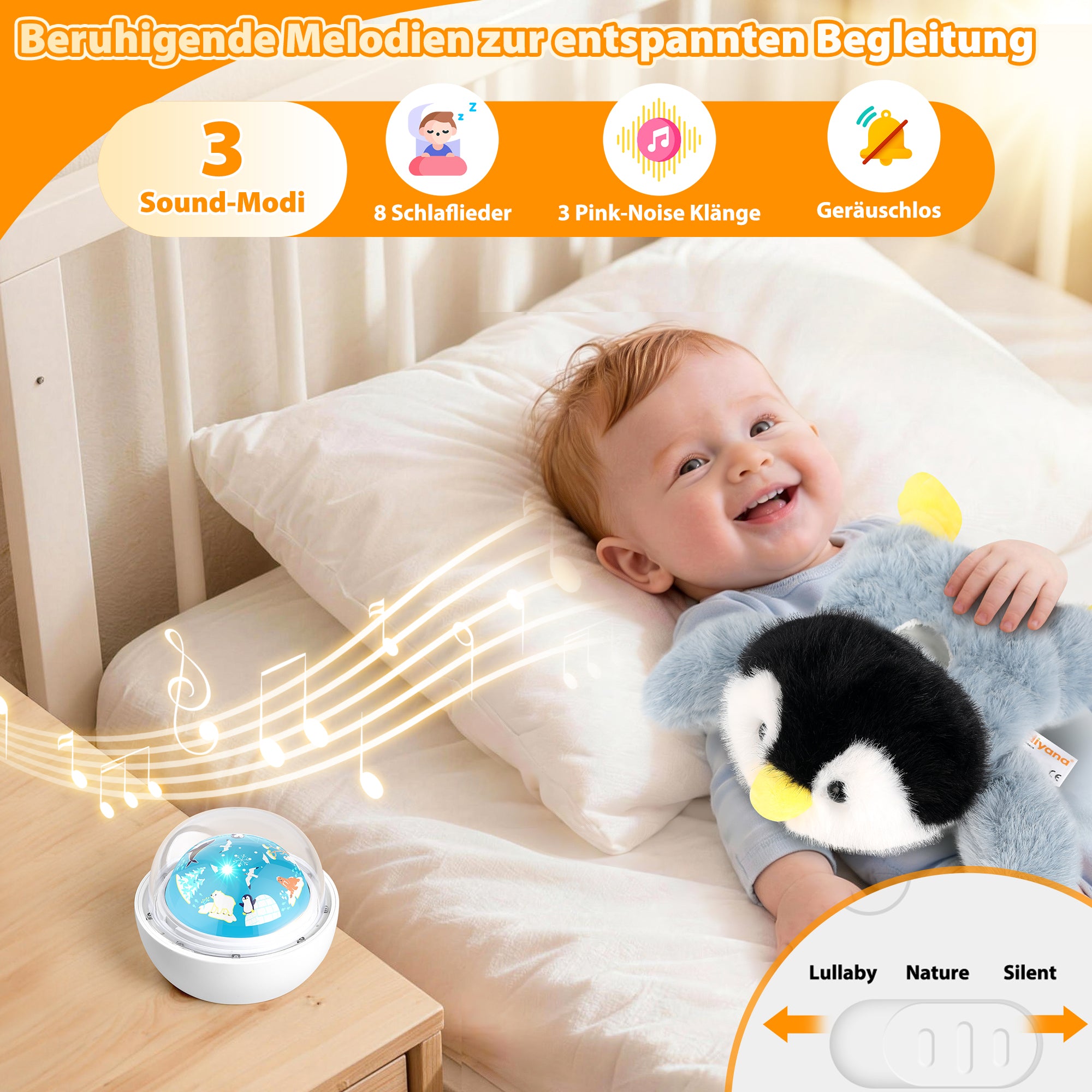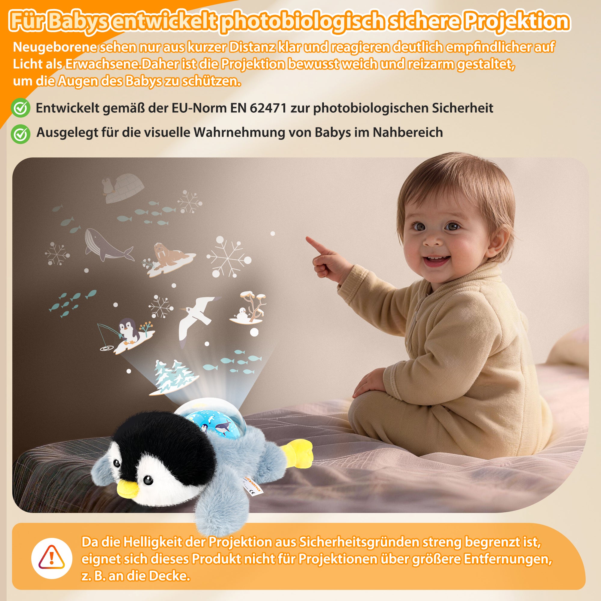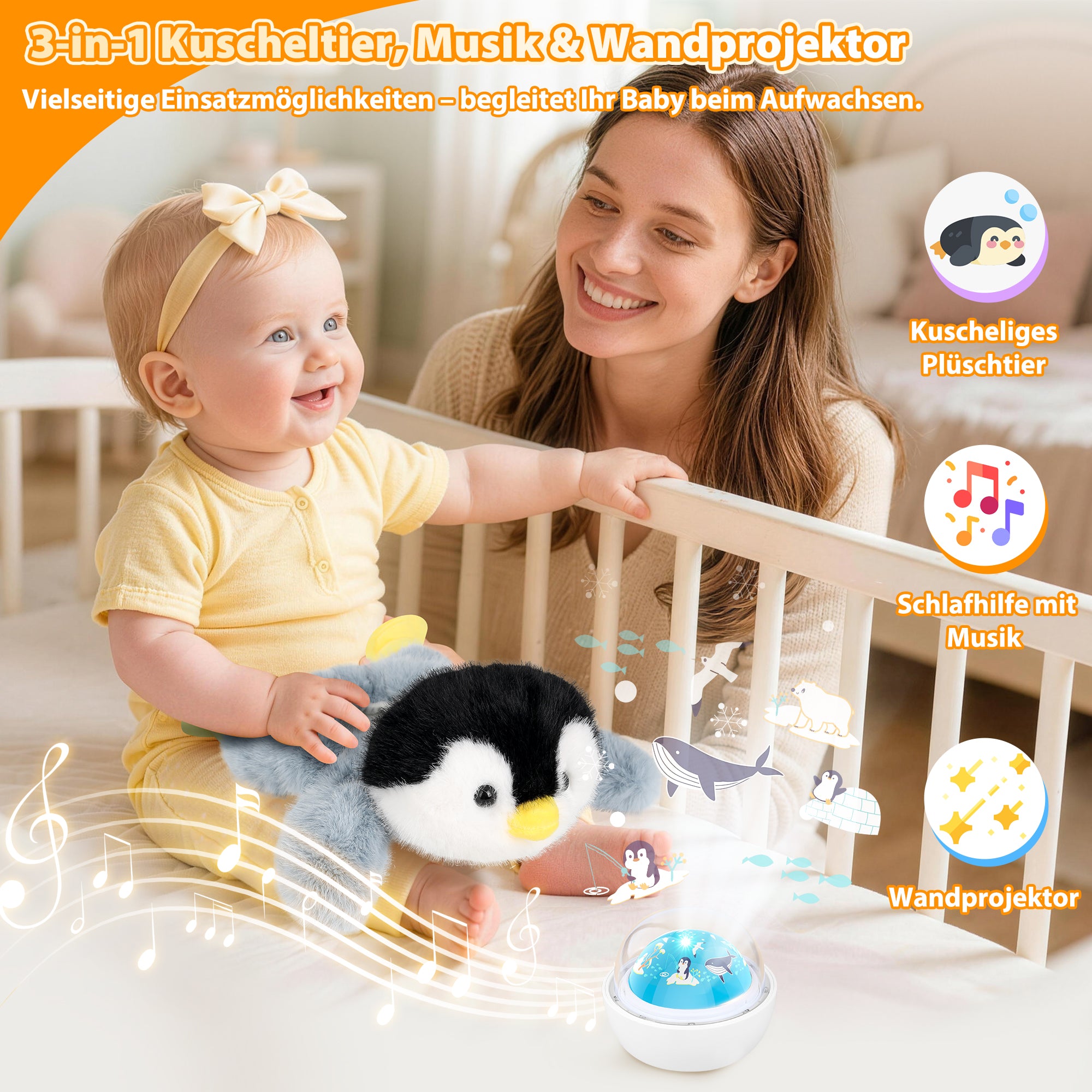 Der Kidiyana Dreamnest Projektor im niedlichen Pinguin-Design verbindet bezaubernde Lichtprojektionen mit sanften Klängen – ideal als Einschlafhilfe und beruhigendes Nachtlicht für Babys und Kleinkinder. Das weiche Plüschtier-Design macht ihn zu einem liebevollen Begleiter im Kinderzimmer, auf Reisen oder bei Übernachtungen.